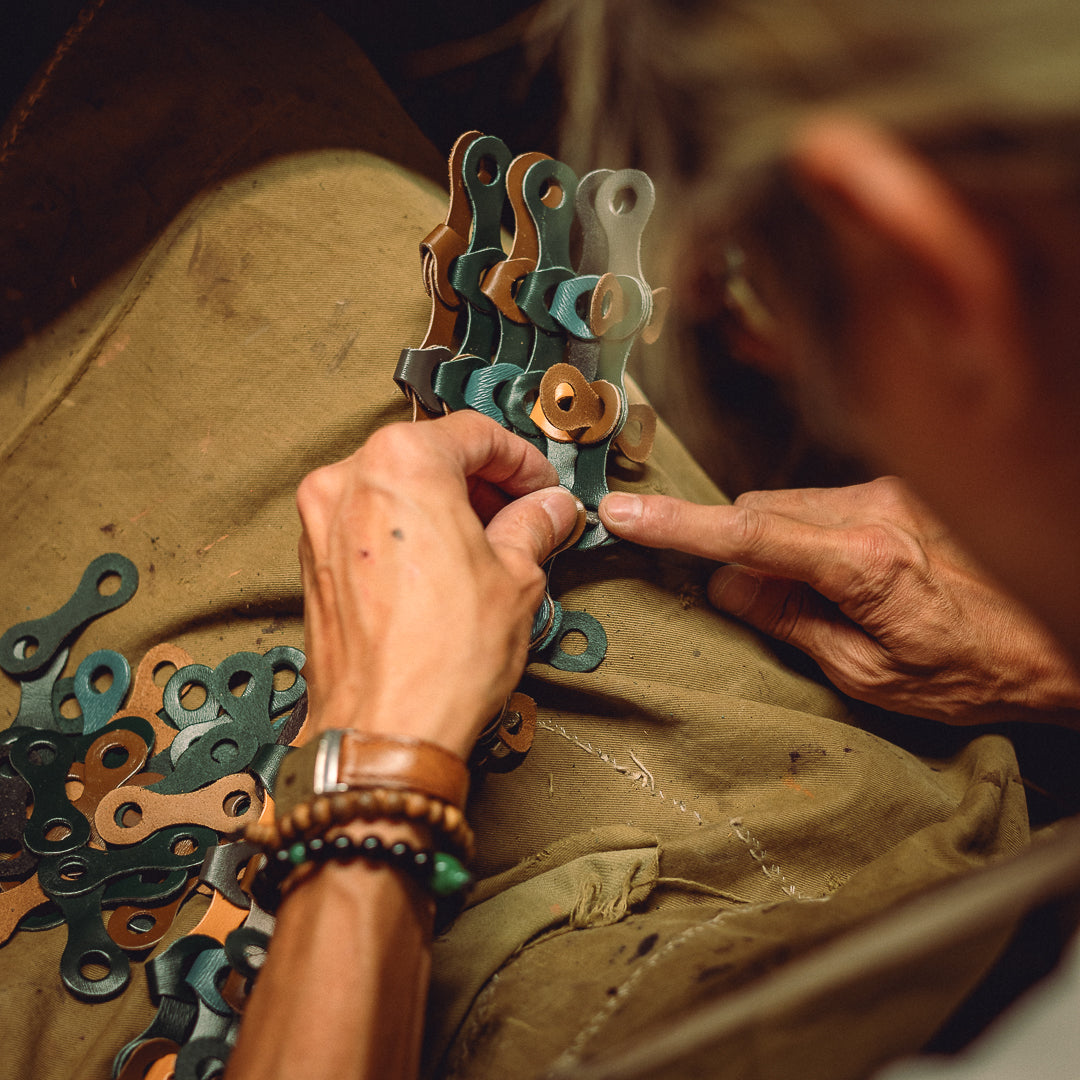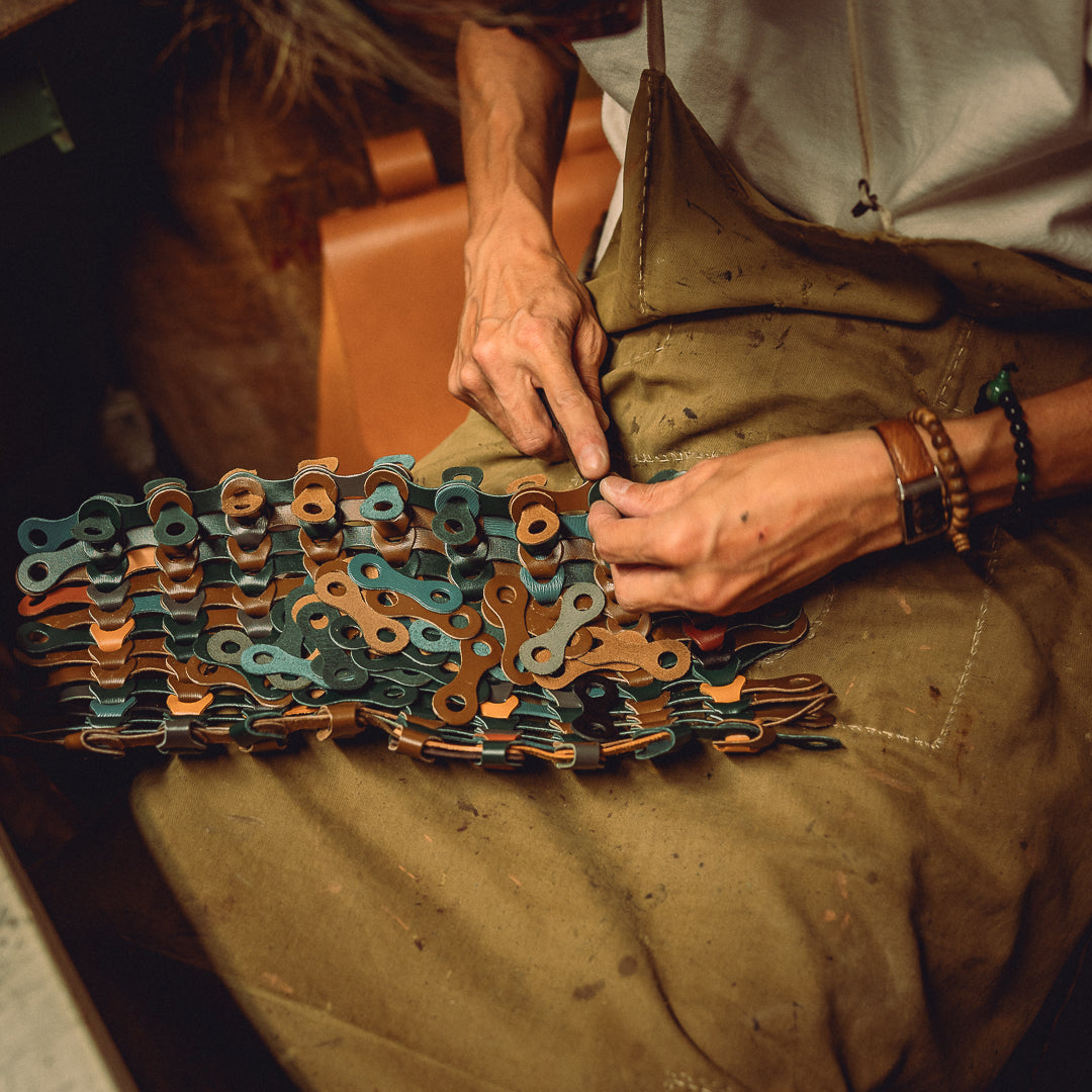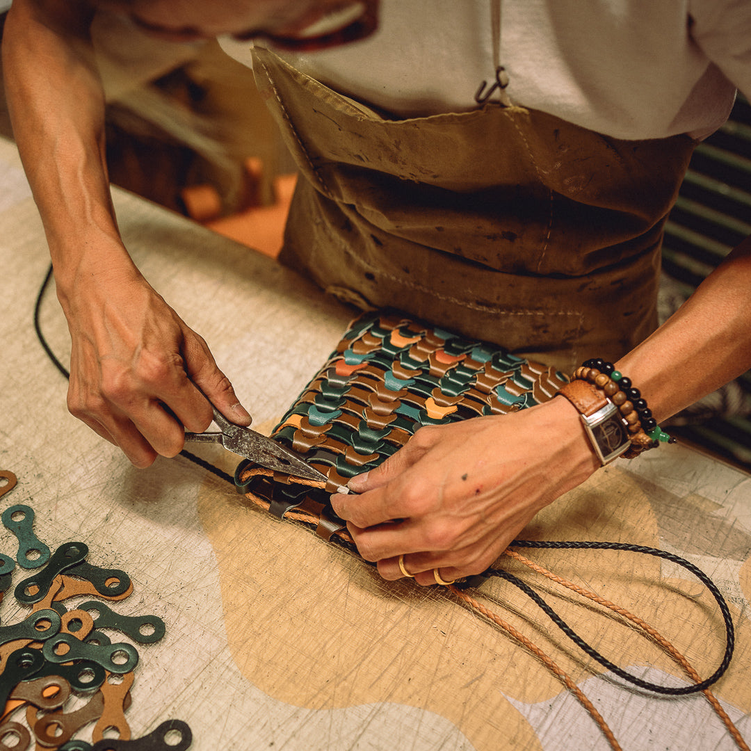 今やil micio のアイコンの一つとなったBohoシリーズは、限りある資源•素材をいかに生かすか、大切にするかが発想の原点だった。 Bohoシリーズは傷んでしまった部分を編み直して修理したり、再度分解して全く新しいアイテム に再生させることもできる。そのピースの形が示すように無限の創造性と無限の再生性を秘めている。このBohoのSDGSシリーズはそんな我々の思いに賛同してくれた、多くのフィレンツェの職人仲間 達からも素材の提供を受けた。頑固な職人達がそれぞれの目利きで選んだ素材、けれども生産状ど う しても使えずに眠っていた素材。様々な種類、加工、年代、色の革があり、それらを使用してものづくりをすると、同じモデルの製品なのに別々な風合い、色味が出て、大量生産かつ全てが一点ものに なる。