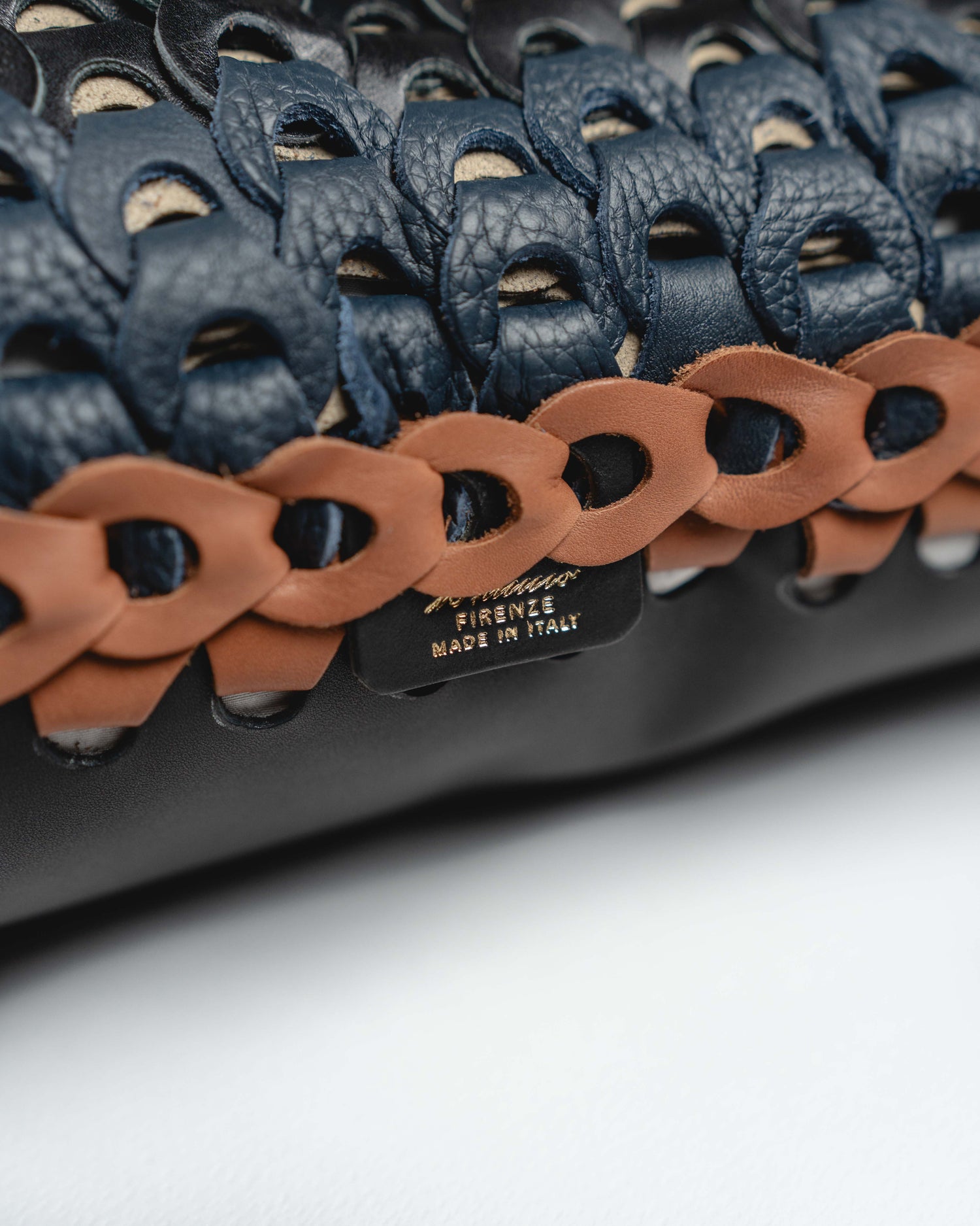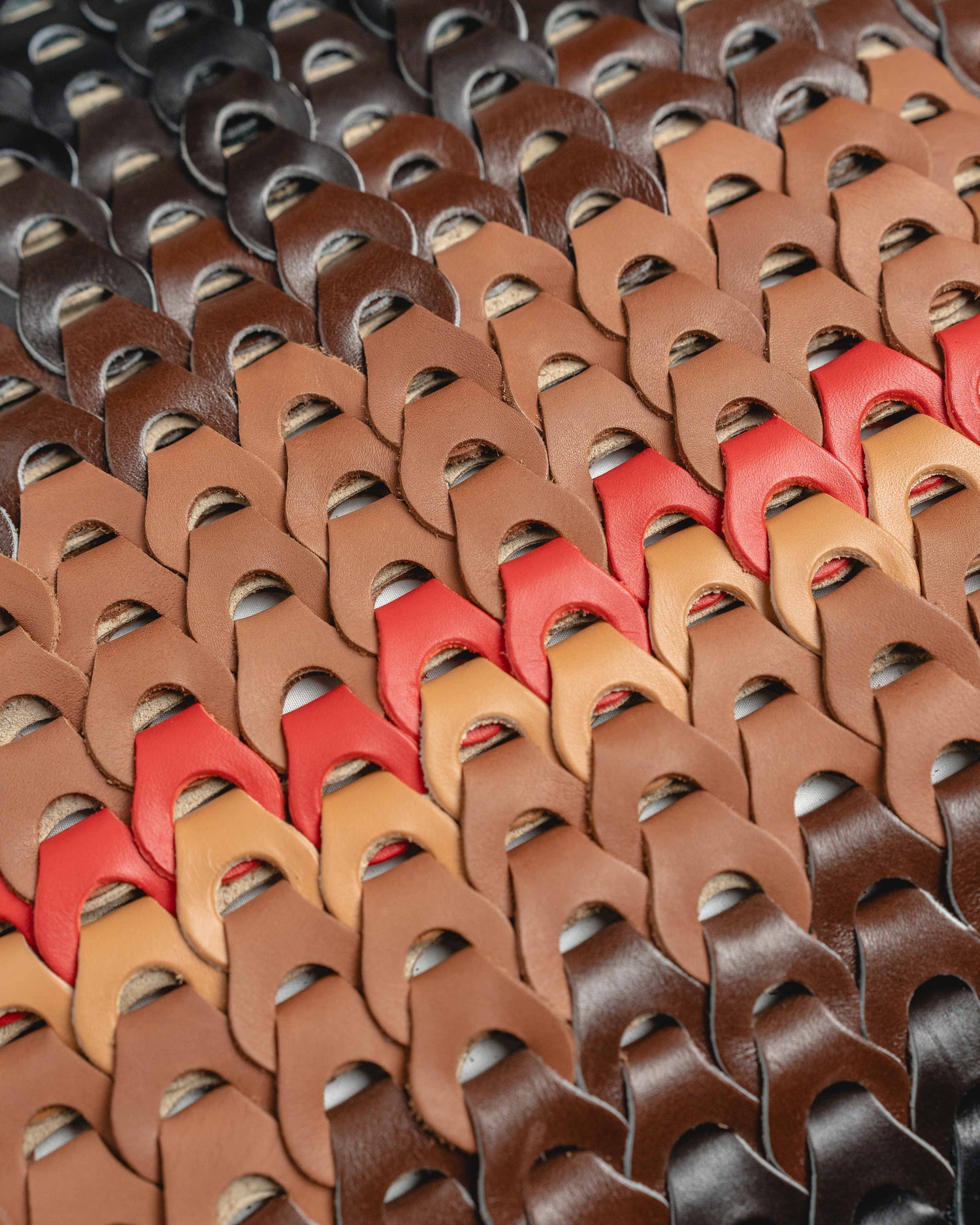 IL MICIOを代表するBOHOシリーズは、革を小さな8の字型に切り抜いて出来たピースを、職人がひとつひとつ手作業で編み上げて作り上げられています。